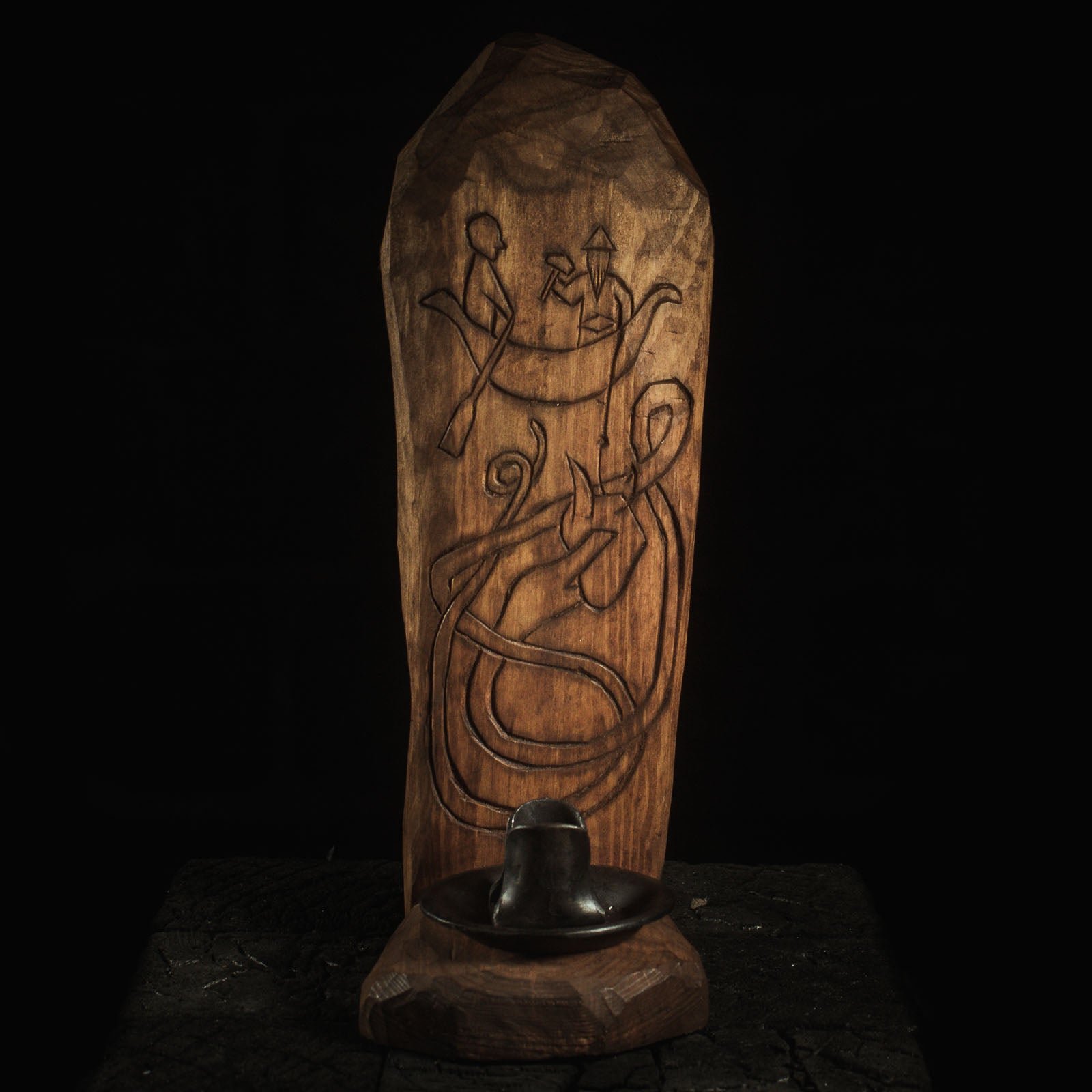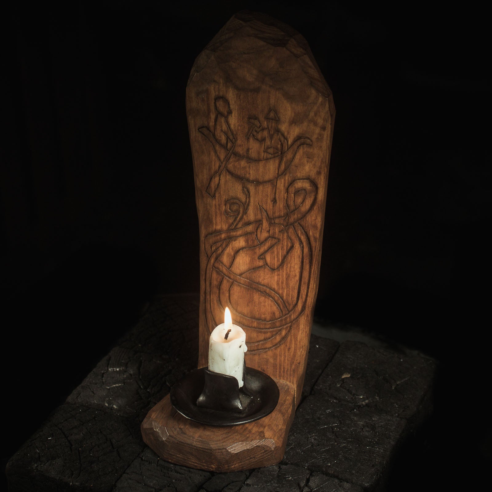 Imagine resting your hand against the cool, forged iron, feeling the stark contrast of the hand-carved wood. This candleholder is a physical manifestation of the struggle between order and chaos—a reminder of your capacity to stand firm when the storm is at its peak.