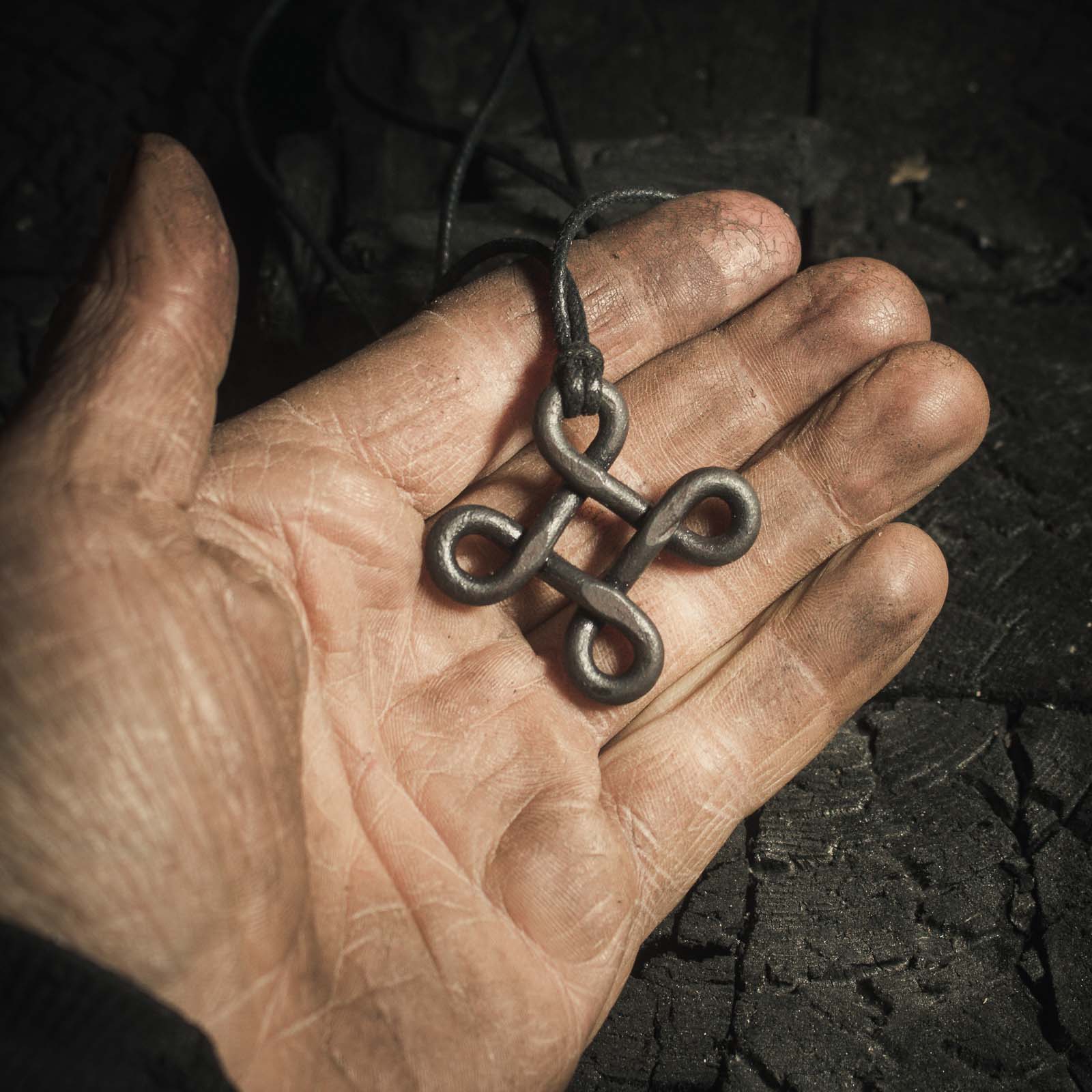 Interwoven Strength and Intentional Design: Hand-forged from enduring iron, this pendant gives solid, tangible form to the protective Hannunvaakuna.