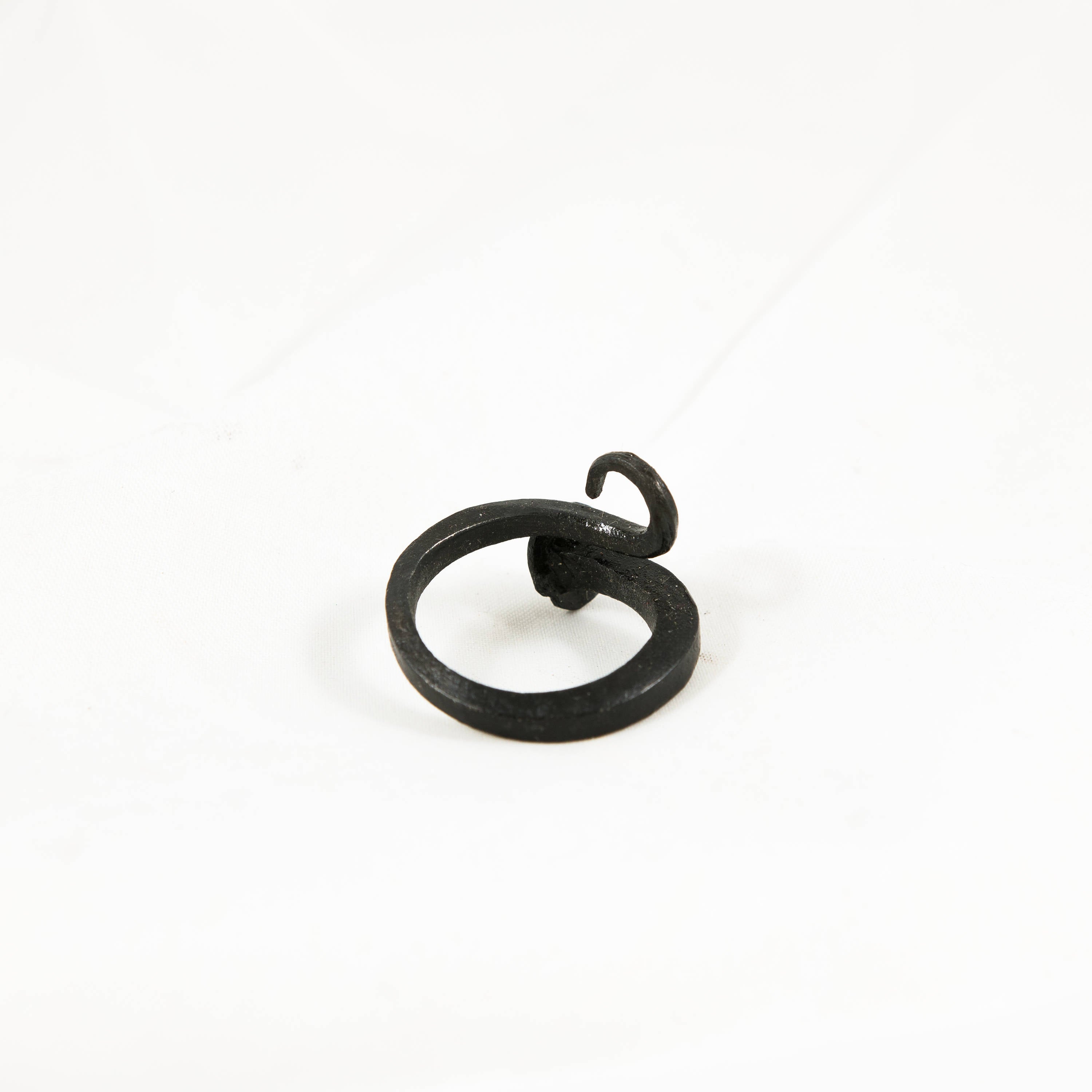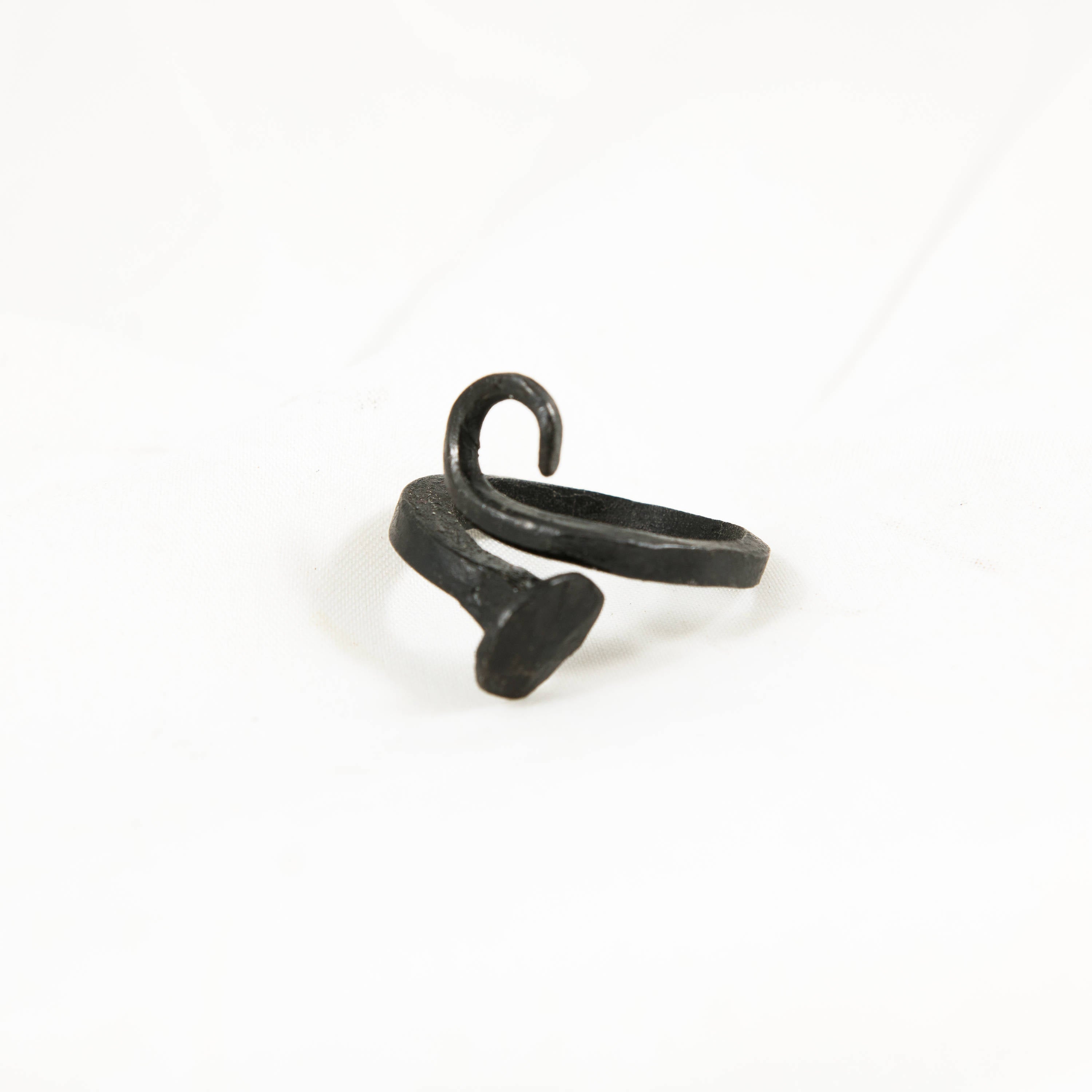 Crafted with Purpose: This ring is hand-forged from solid iron, shaped by the blacksmith's skill from nail-like stock. The head and point are integral to the design, the metal expertly bent and coiled to form a wearable ring. The process requires careful heating and hammering to achieve the distinctive shape while preserving the authentic texture of the forged iron. Each ring is a unique piece, bearing the honest marks of its creation at the anvil.