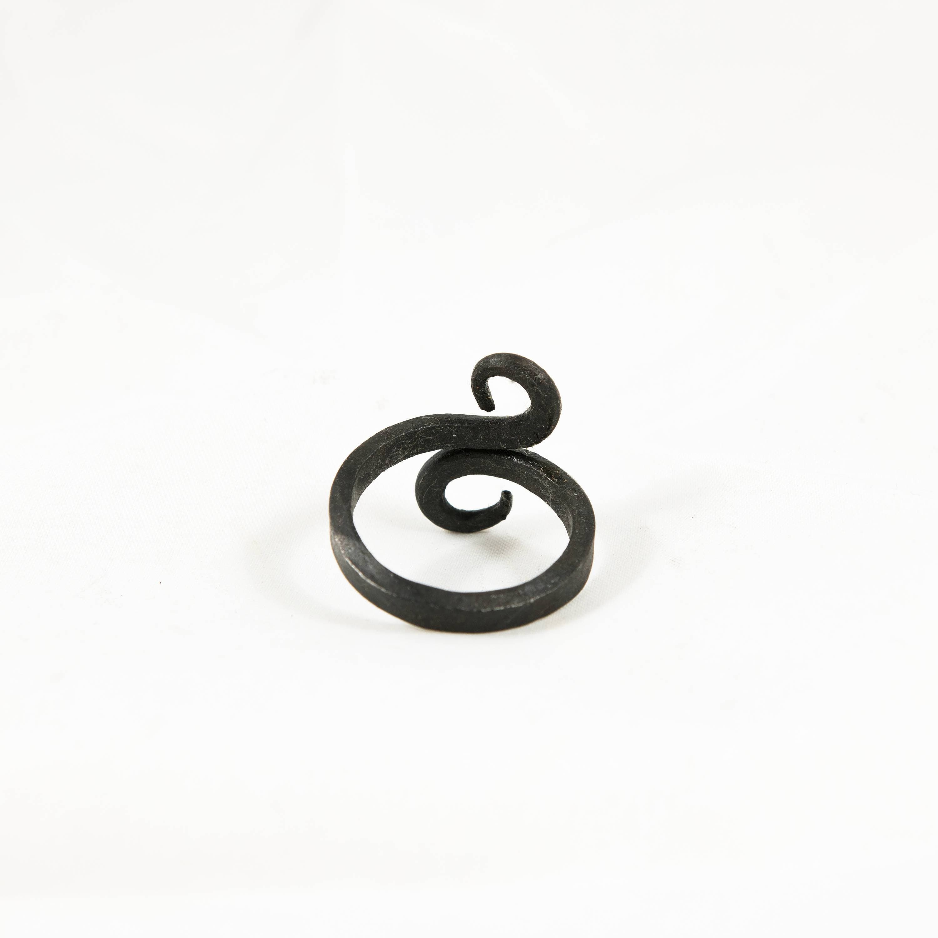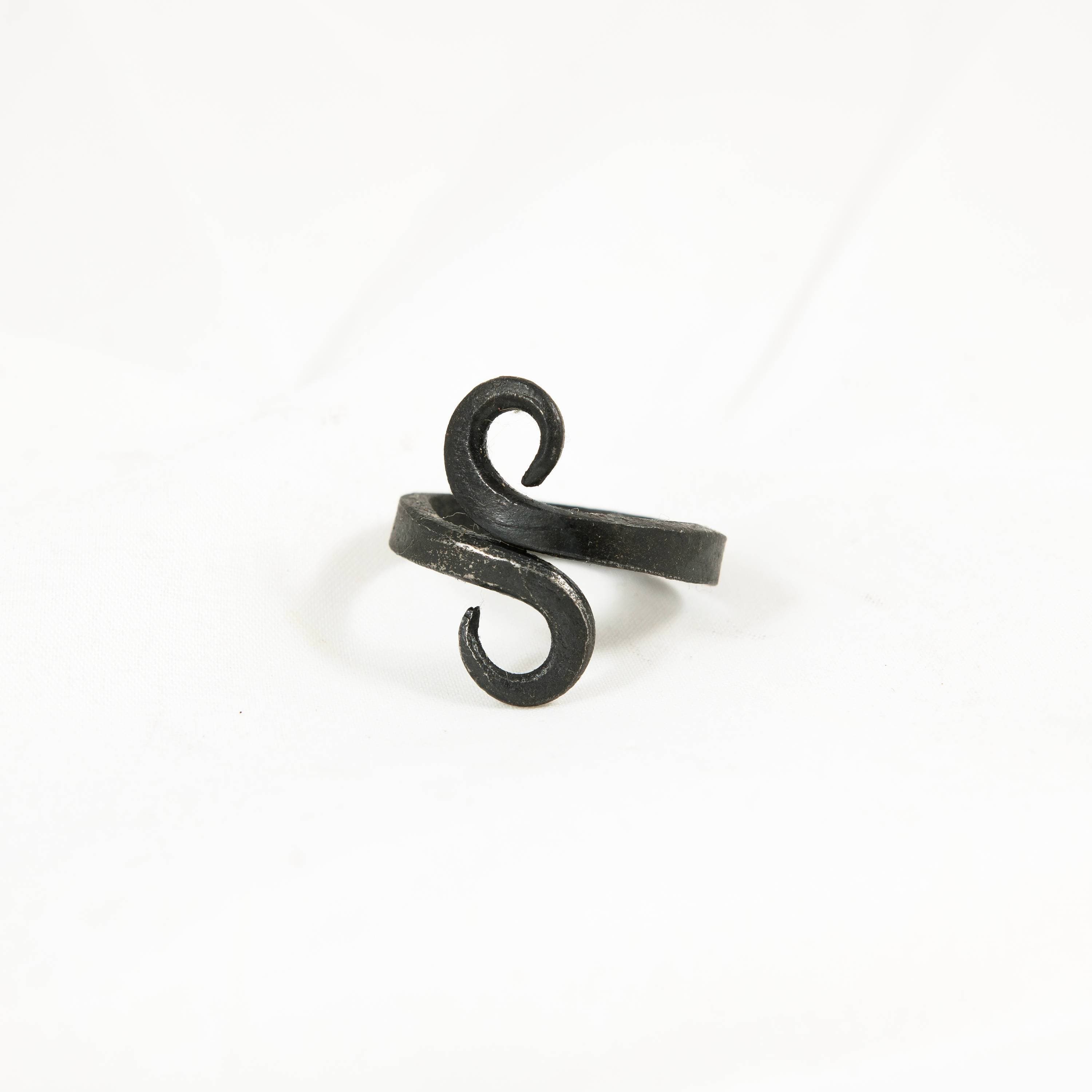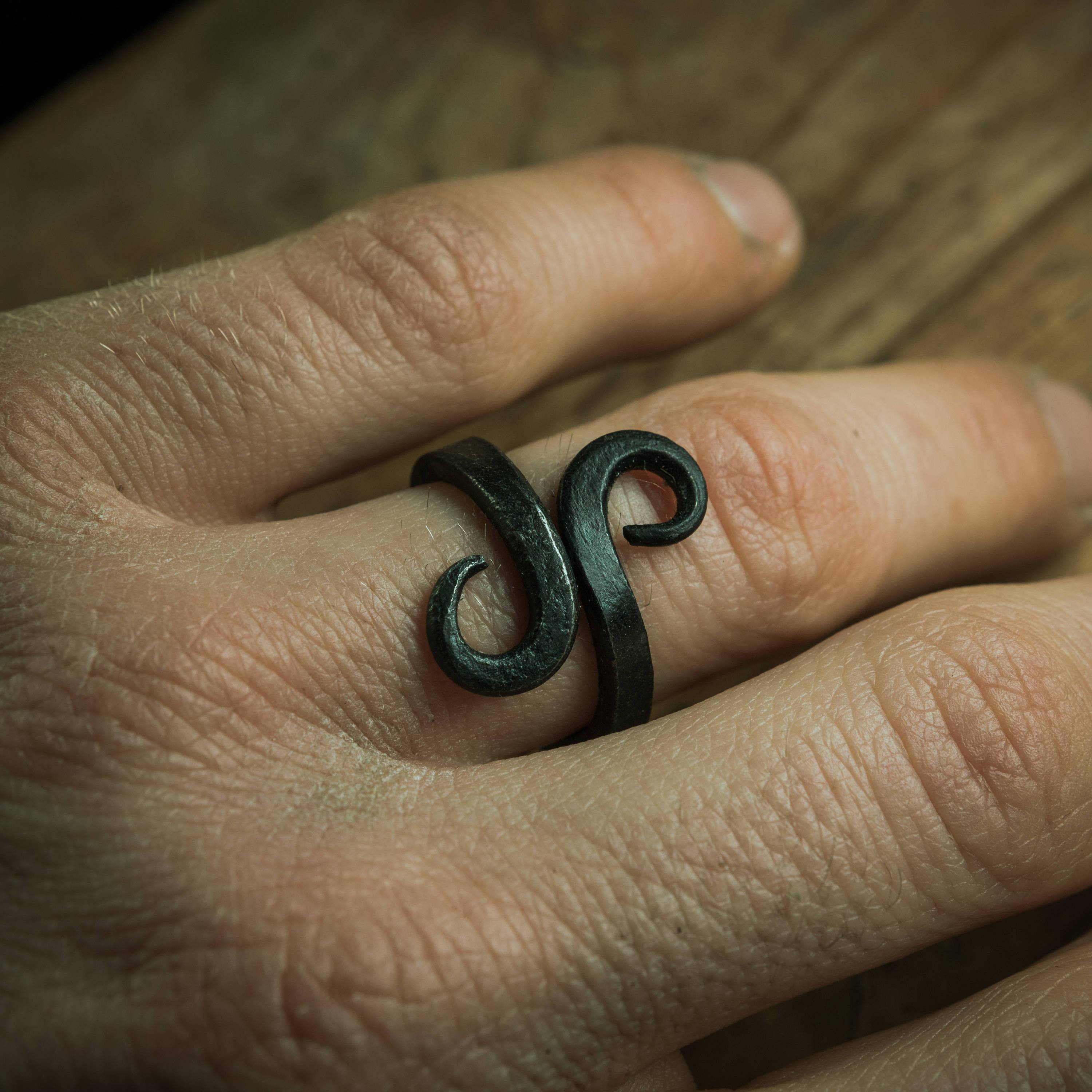 Crafted with Purpose: Hand-forged from iron, this ring is shaped individually by the smith. The band is formed and then the ends are curled into decorative scrolls, overlapping where they meet. The process leaves visible hammer marks and a unique texture on the iron, ensuring that while the design is consistent, each ring has its own character. It's a piece of enduring quality, shaped with both strength and artistry in mind.