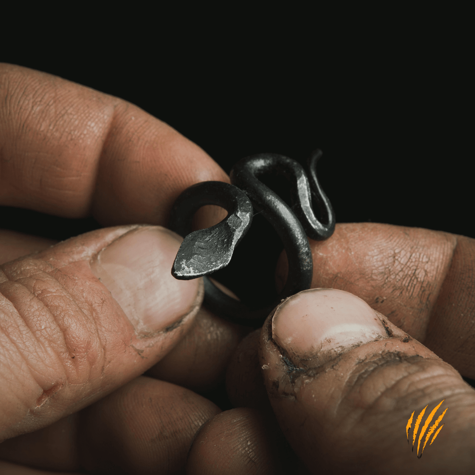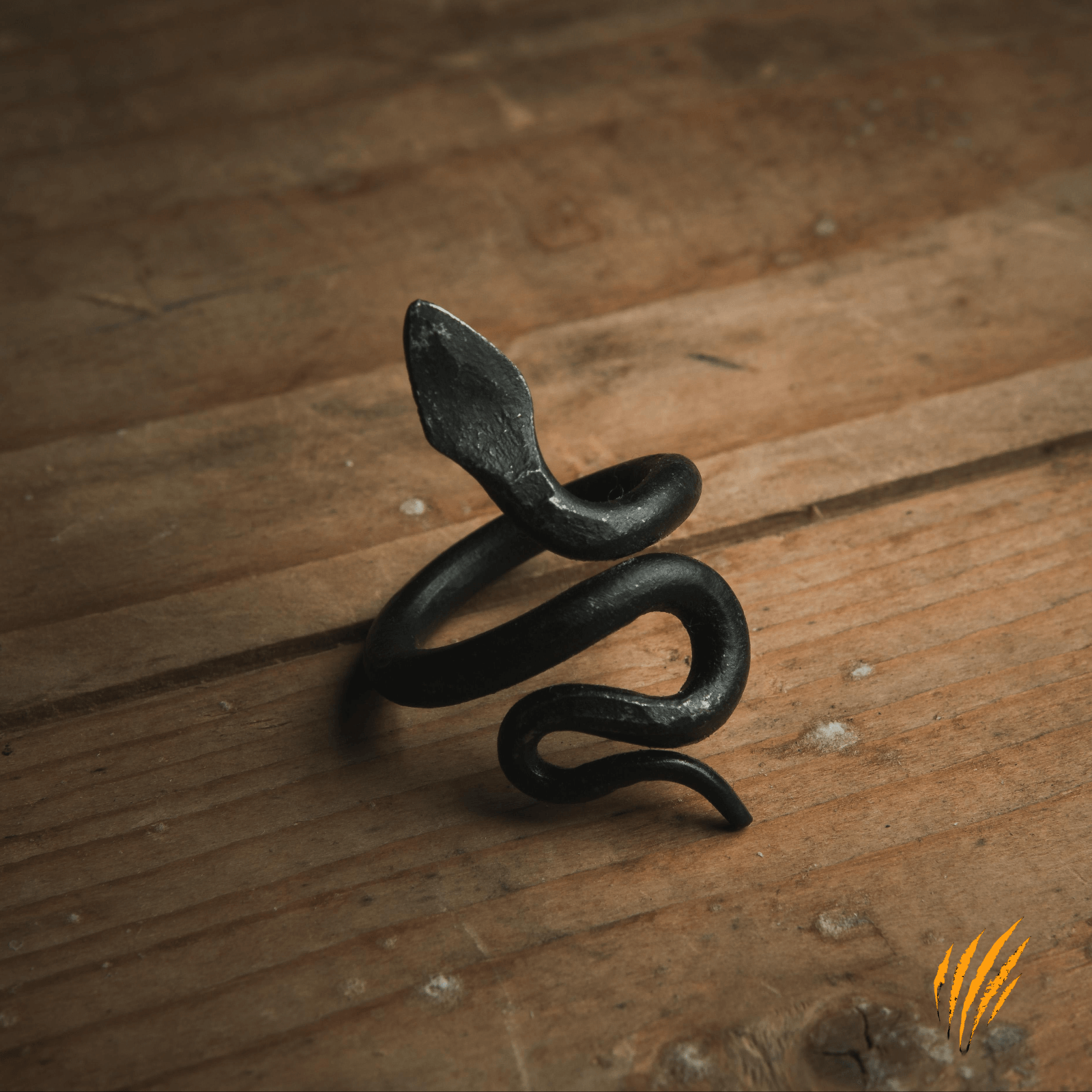 Crafted with Purpose: Hand-forged from robust iron, this ring is shaped with the smith's skill to embody the dynamic form of a serpent. The metal is carefully worked to create the curves of the body, the distinct head, and the tail that wraps around to form the band. The process leaves a palpable texture and character on the iron, ensuring each ring is unique and feels substantial. It is a piece of wearable art that speaks of dedication and enduring craftsmanship.