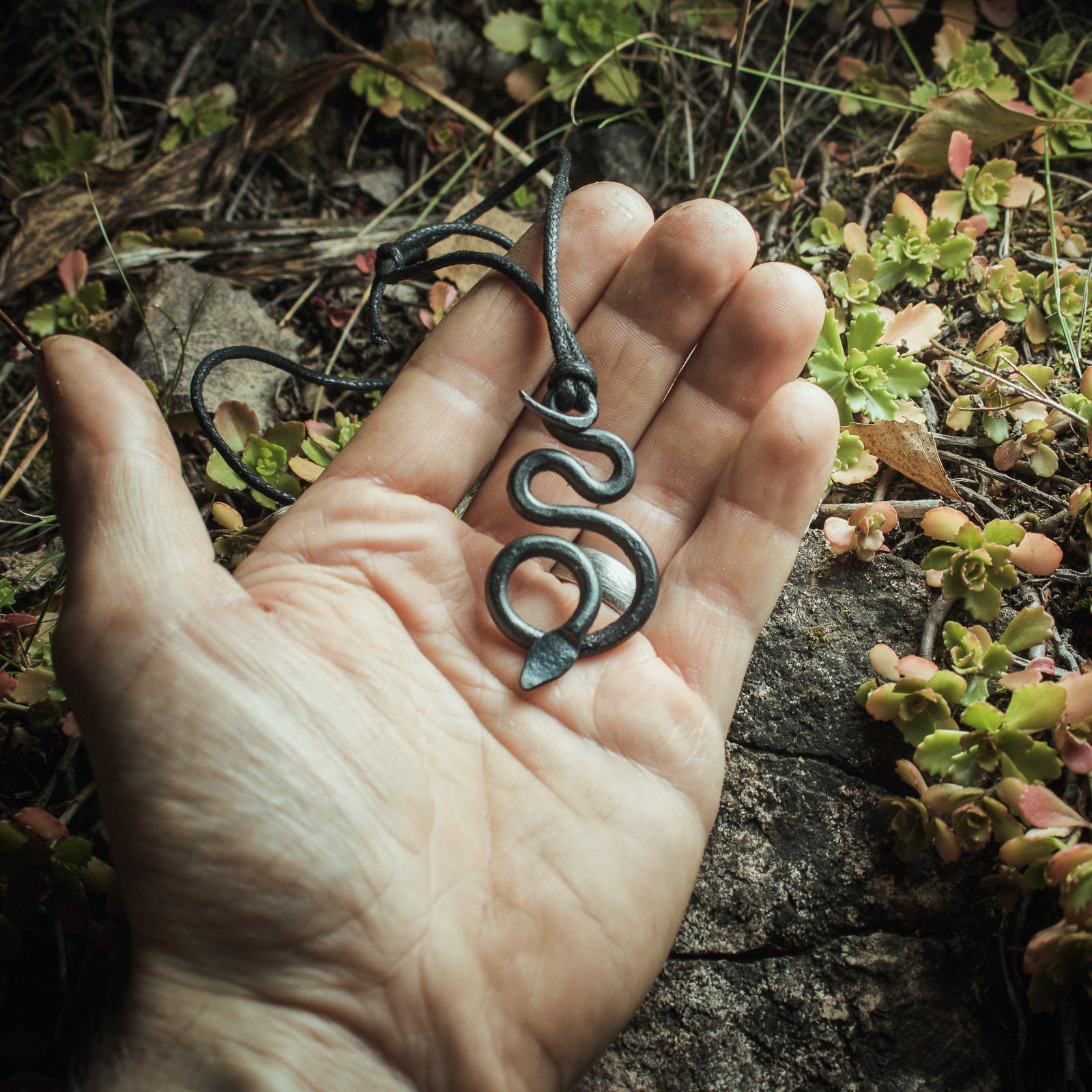Crafted with Purpose: Hand-forged from iron, this serpent pendant is brought to life through the skillful manipulation of hot metal. The smith's hammer shapes the raw material into the serpent's dynamic form, giving it a palpable sense of movement and ancient energy. The texture bears the honest marks of the forging process, making each piece truly unique and steeped in the tradition of ironwork.