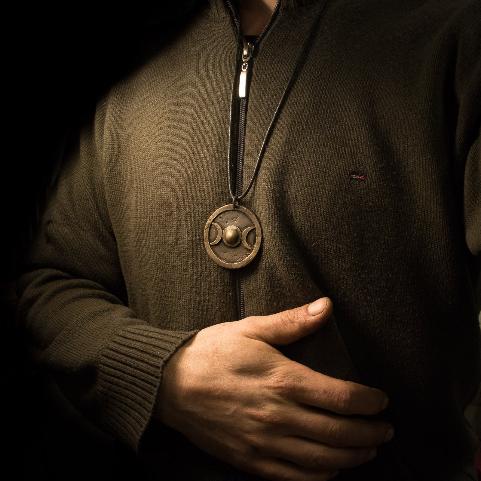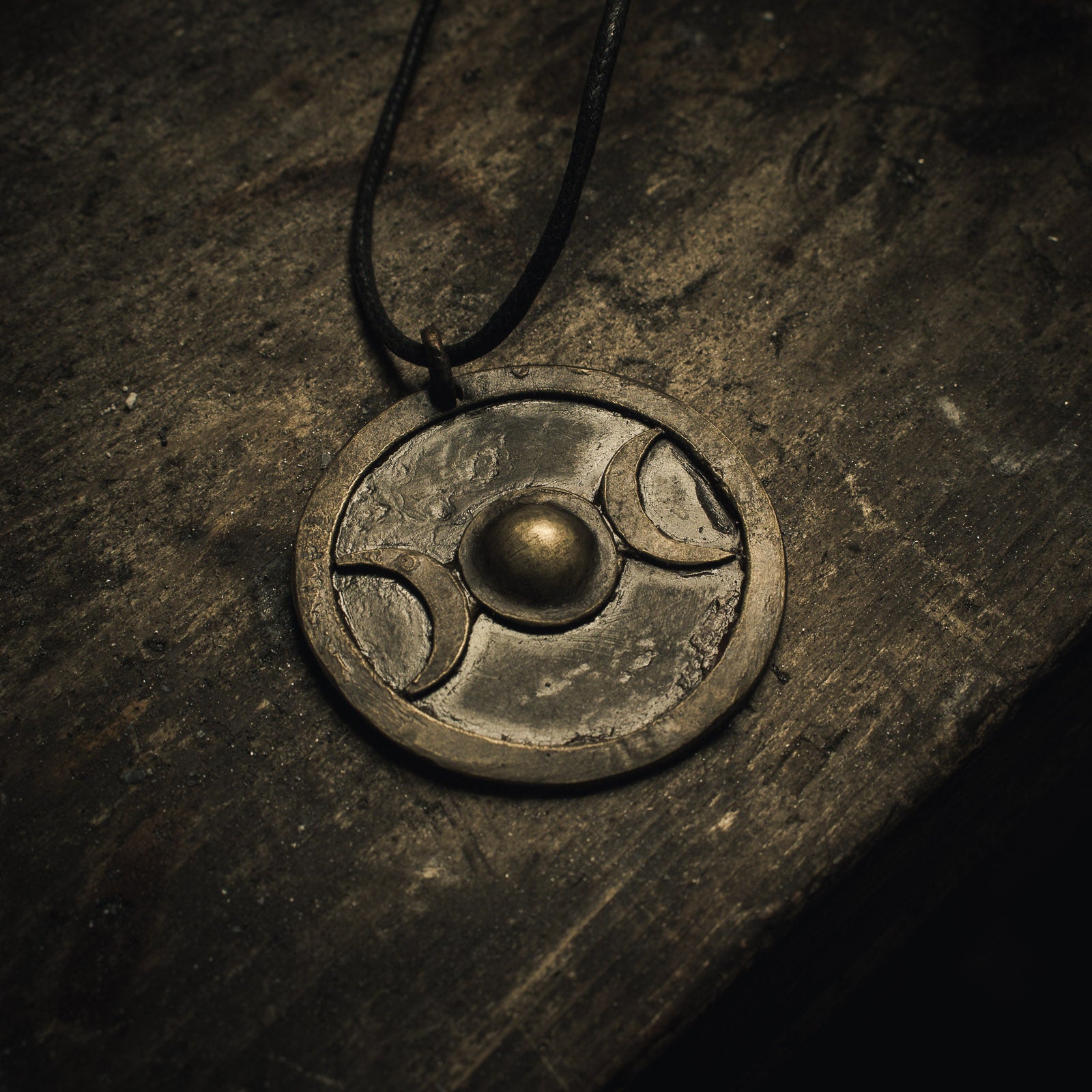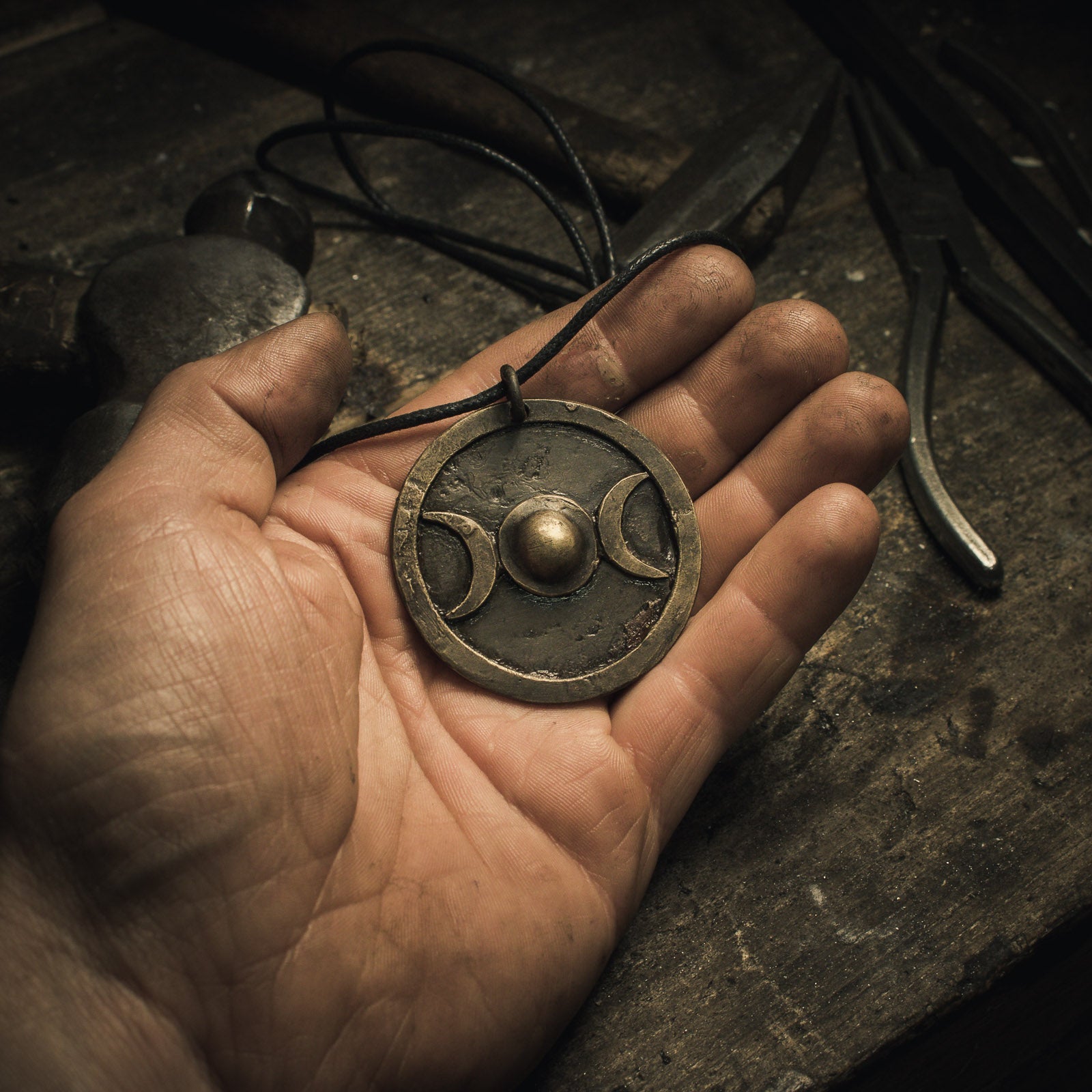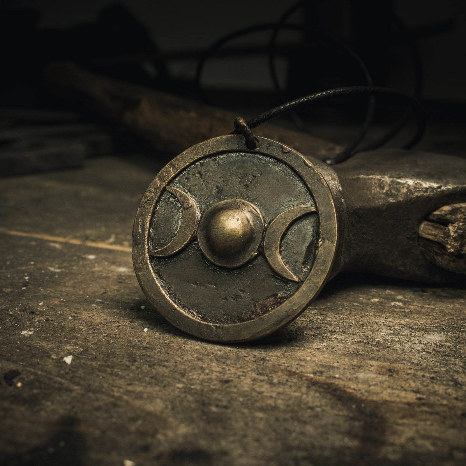 Crafted with Purpose: This pendant is hand-forged from solid iron, a material deeply connected to history and enduring strength. The circular disc is shaped by hammer and fire, creating an earthy, tactile surface that speaks of the forge. The triple moon motif is then carefully rendered within the iron, either by being raised, etched, or hammered into the metal with deliberate care. Each piece bears the unique marks of its creation, a direct link to the smith's skill and the fundamental traditions of ironwork.