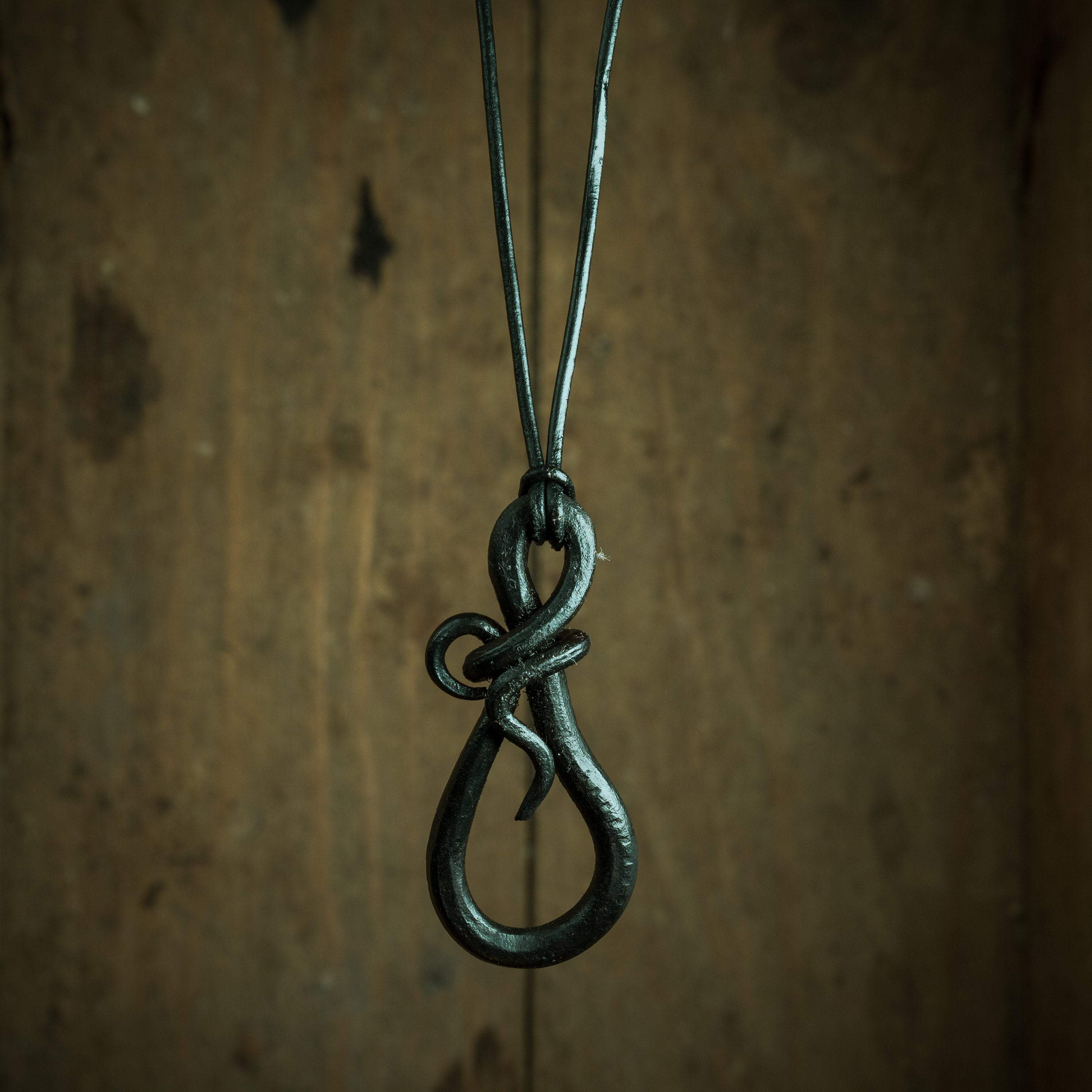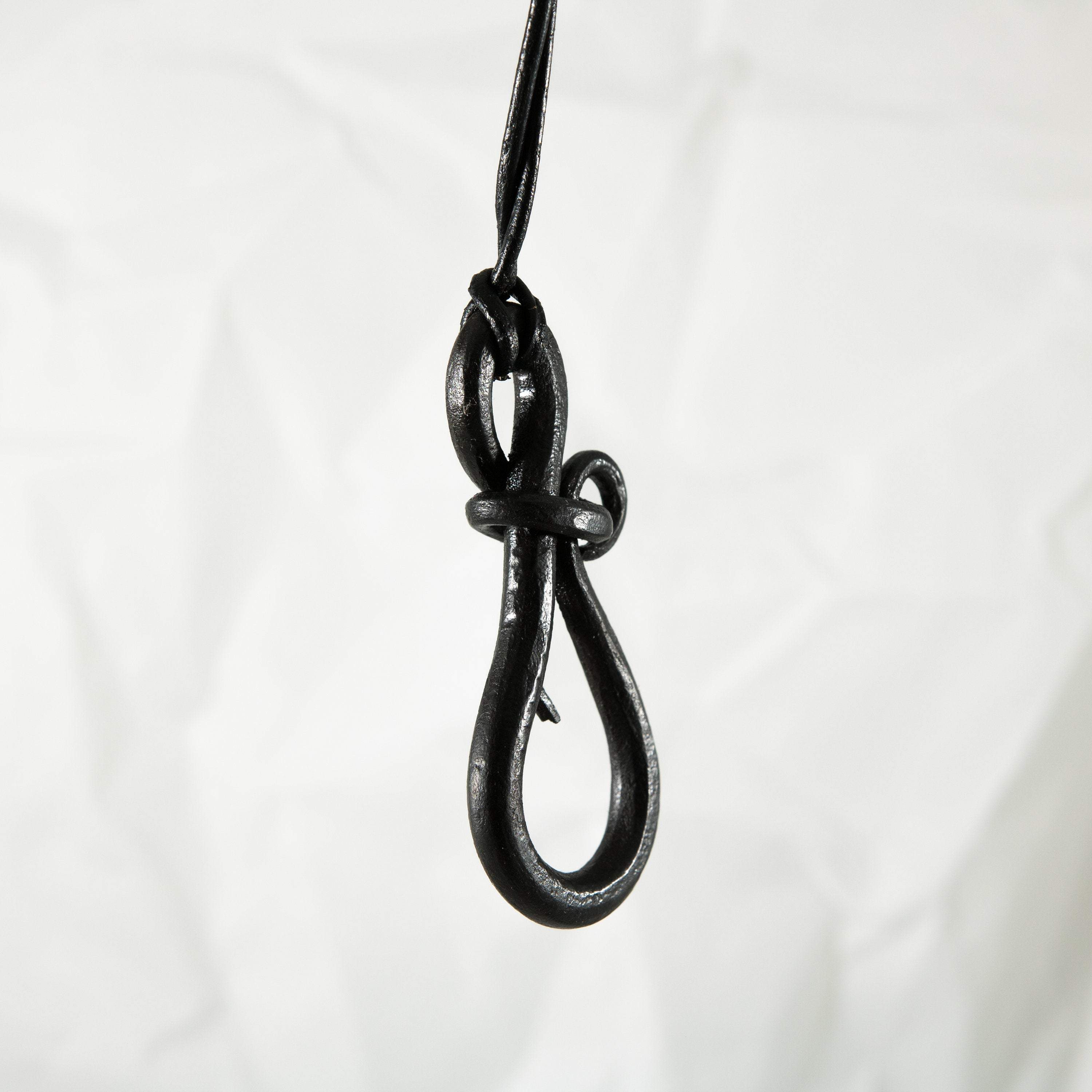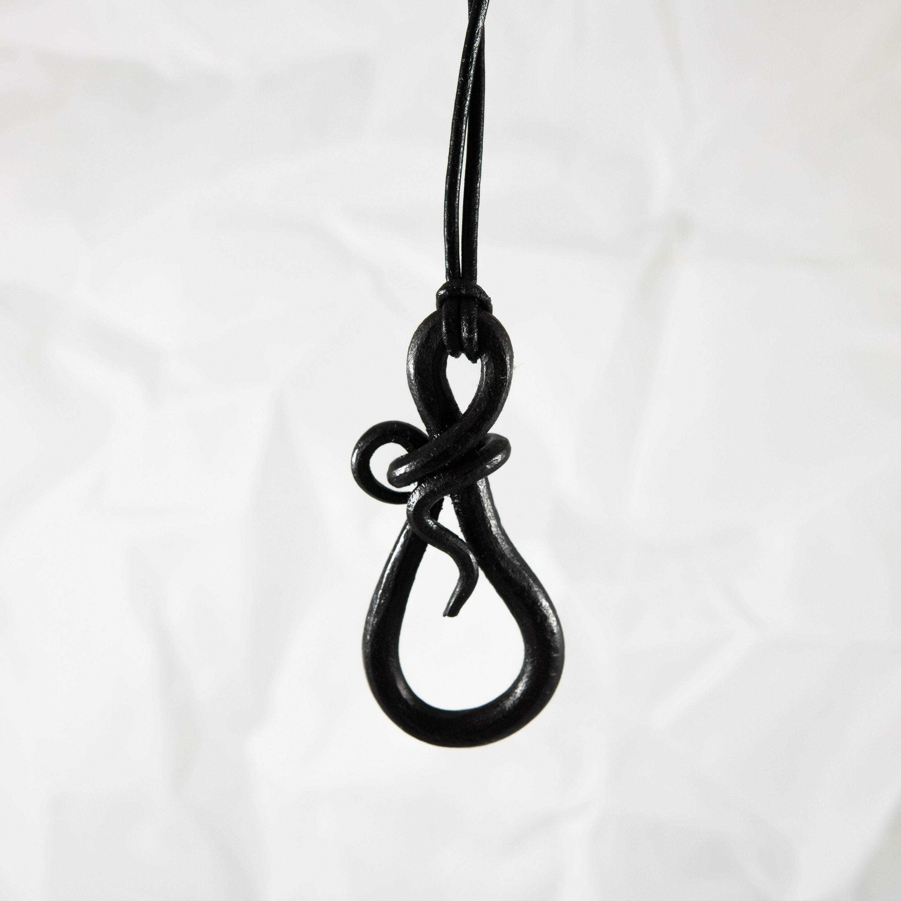 Crafted with Purpose: This pendant is hand-forged from solid iron, shaped at the anvil into the elegant teardrop form. The metal is carefully worked to create a smooth curve, while retaining the subtle texture left by the hammer. The integrated loop for hanging is seamlessly formed, demonstrating the skill required to create a fluid shape from solid metal. Each piece is a unique result of traditional forging techniques, a tangible expression of craftsmanship.