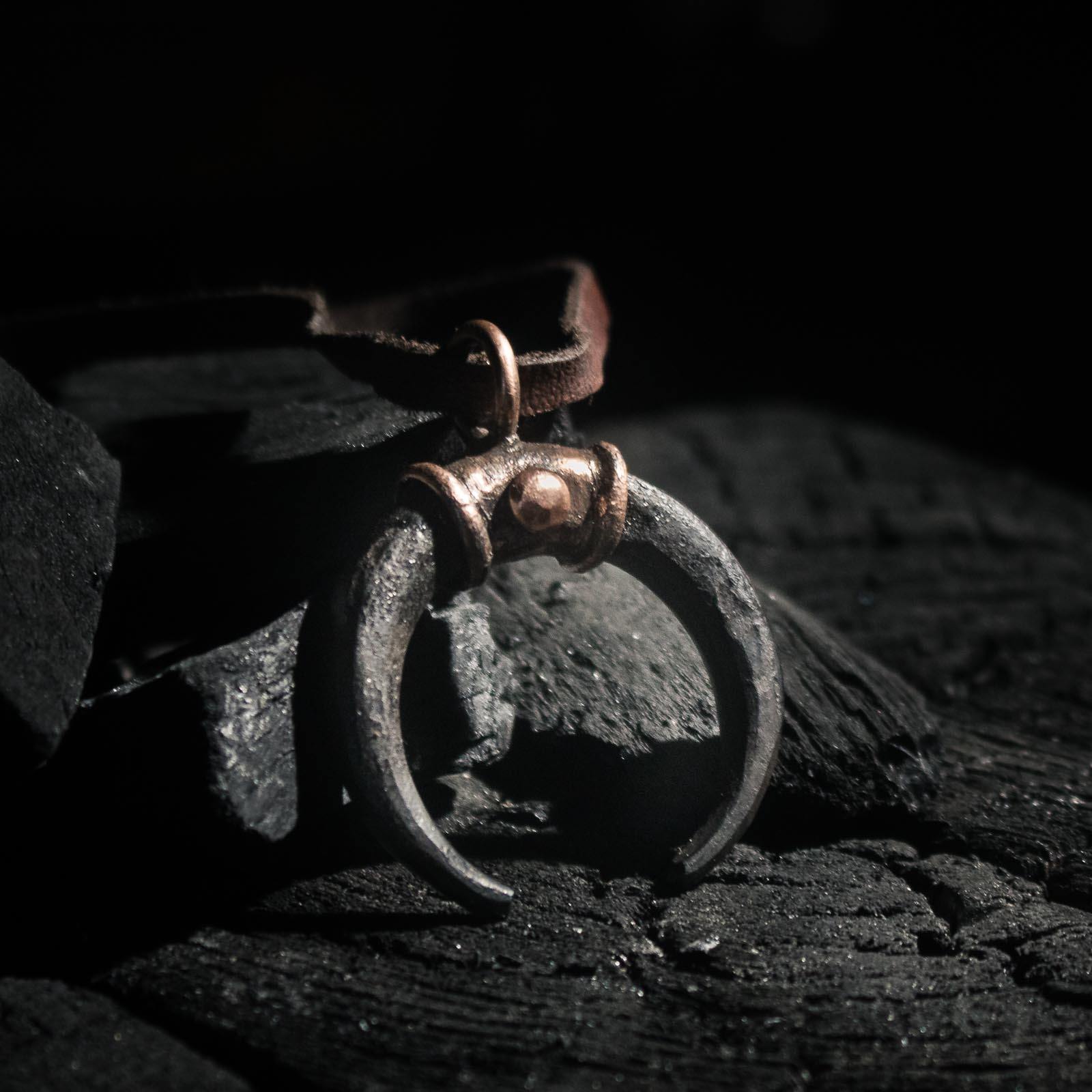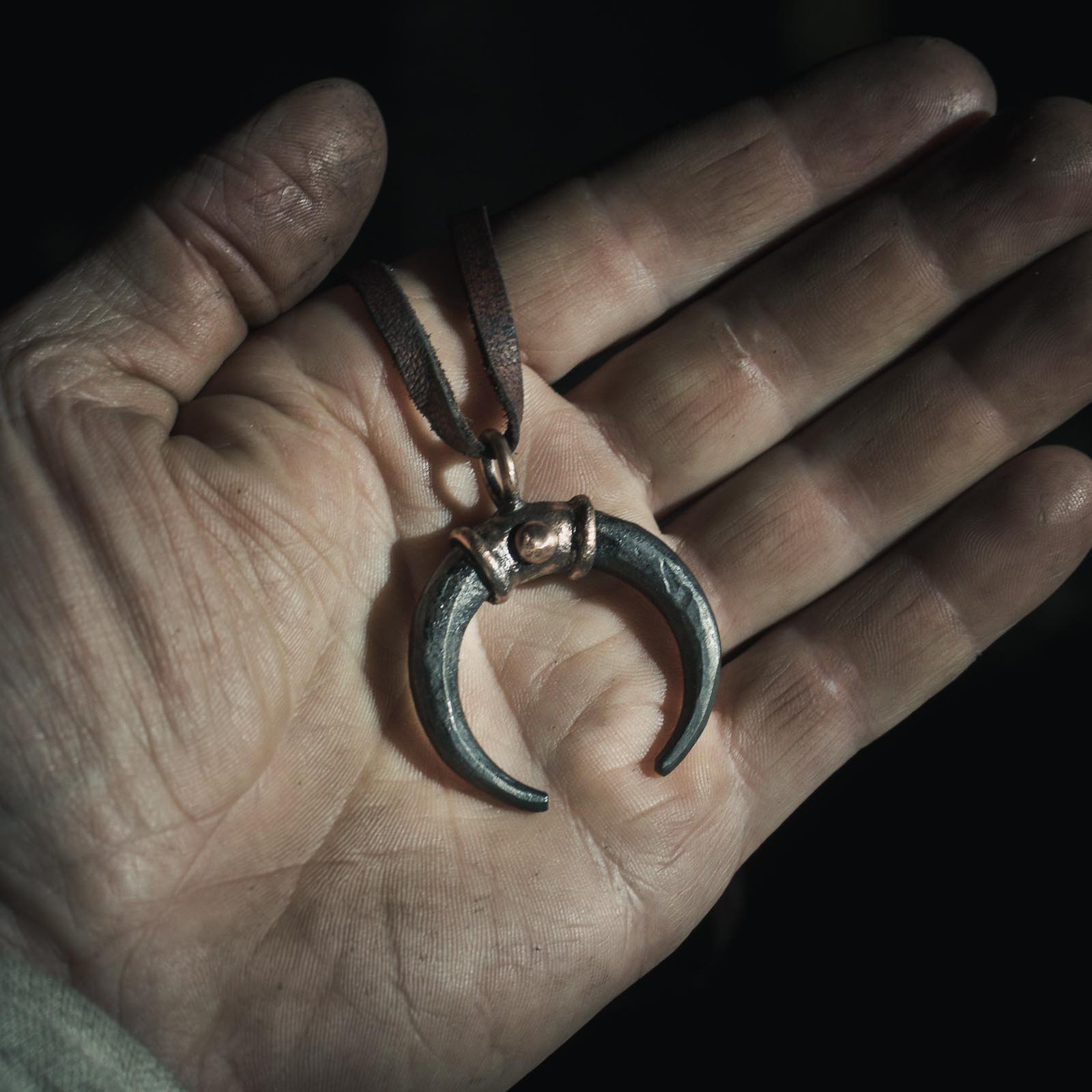 Crafted with Purpose: Hand-forged from iron, this pendant embodies the solid endurance that underpins the ephemeral beauty of the moon. The smith shapes the raw metal into the familiar crescent, its surface bearing the honest texture and character left by the hammer. The top is carefully wrapped with copper, creating a secure and visually integrated bail. This is a piece of enduring craftsmanship, connecting you to both celestial cycles and the earth.