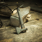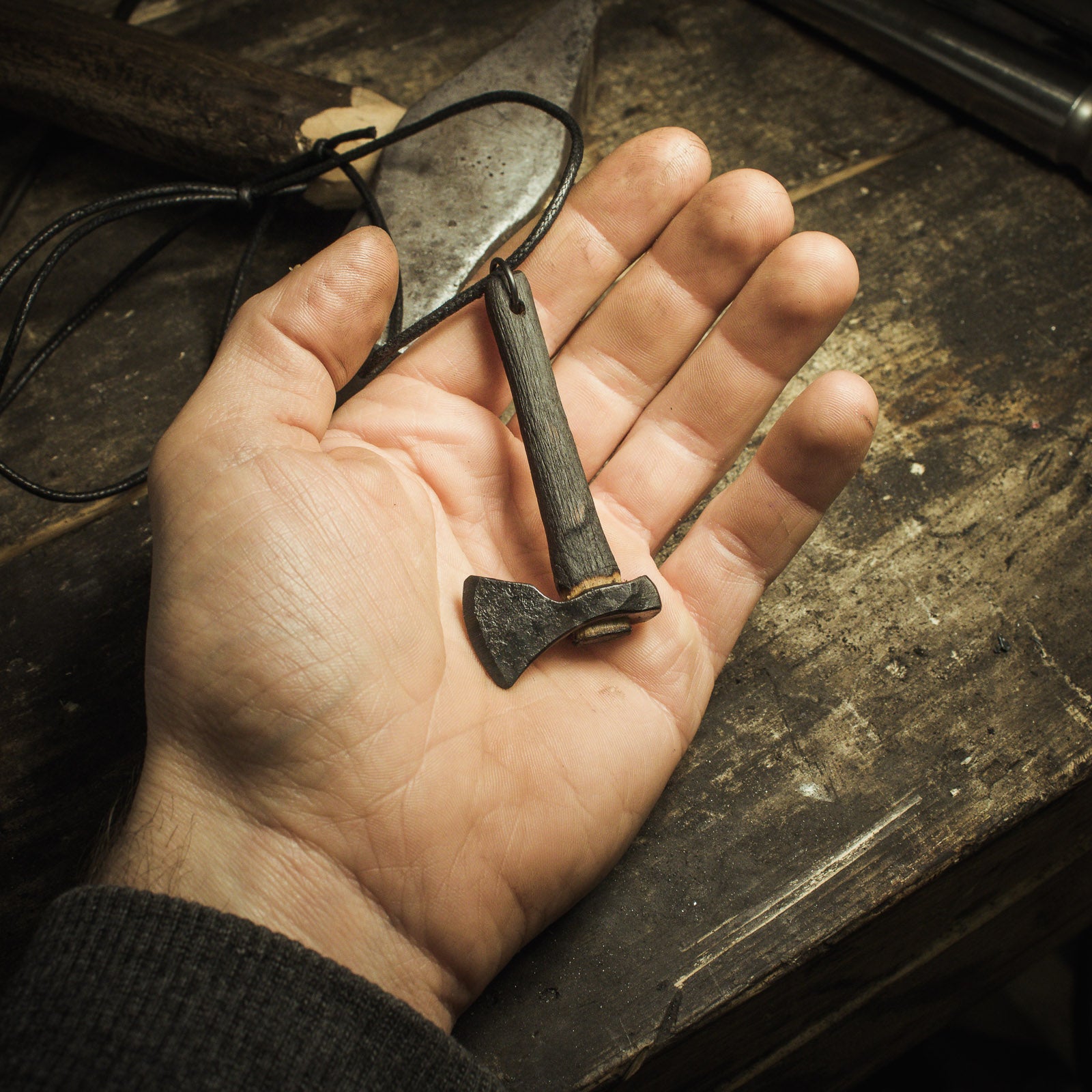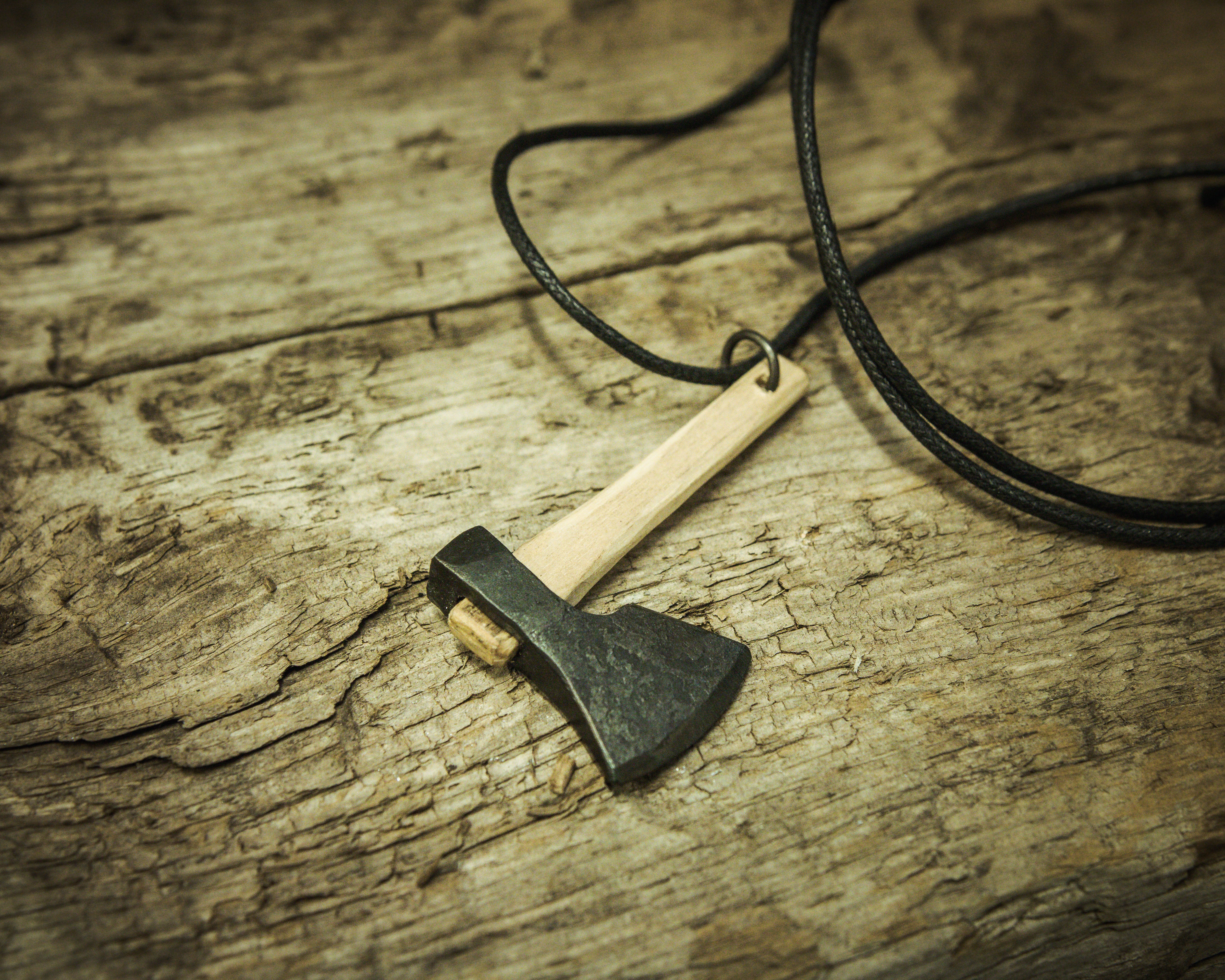 Crafted with Purpose: This pendant features a miniature axe head, hand-forged from durable iron or steel, shaped to capture the characteristic "beard" of its historical inspiration. The metal is hammered to create an authentic texture, reflecting the raw process of the forge. A small, carefully shaped wooden handle is then fitted to the eye of the axe head, joining the two elemental materials. This requires precision and skill to ensure a secure and balanced miniature tool, a true testament to traditional craftsmanship in both metal and wood.