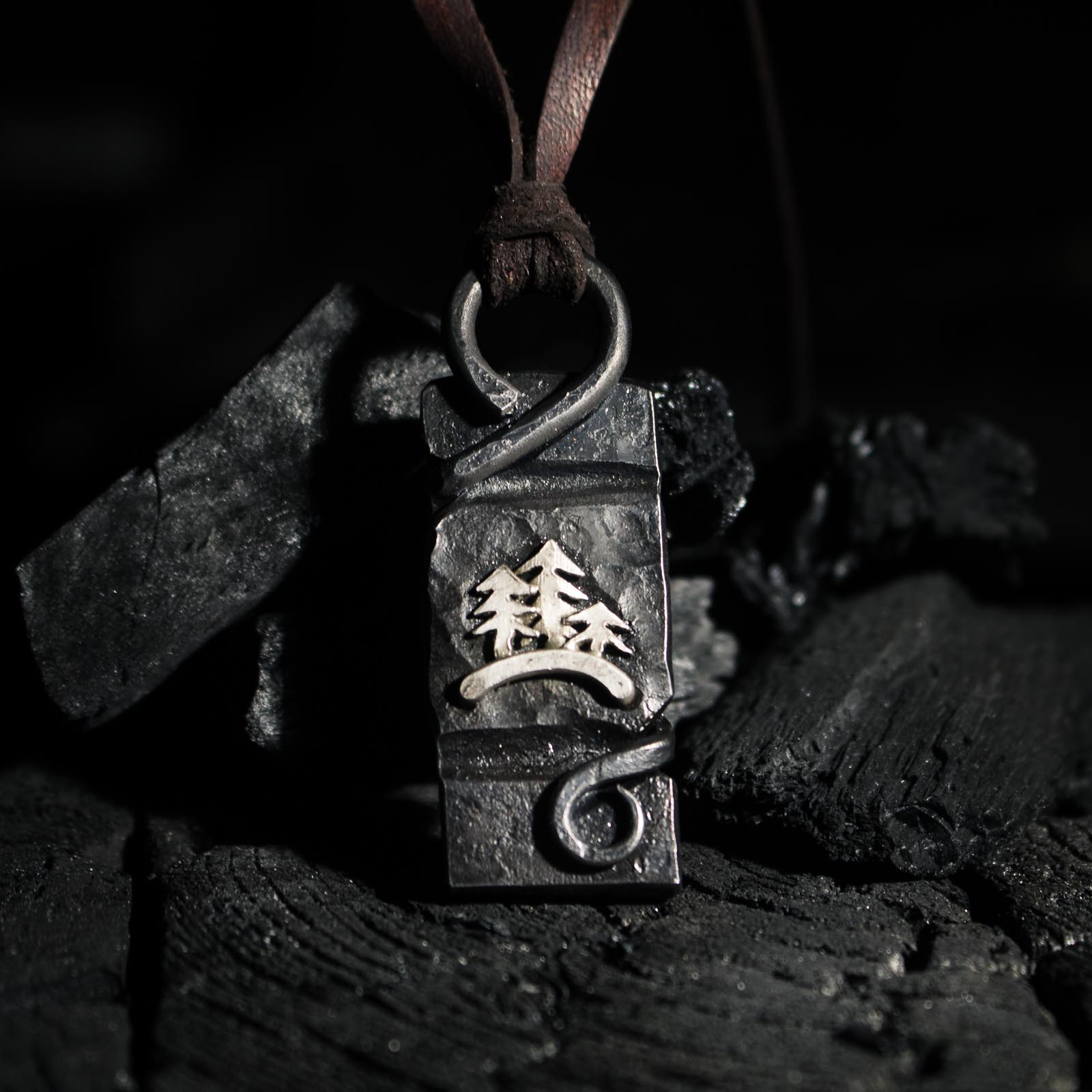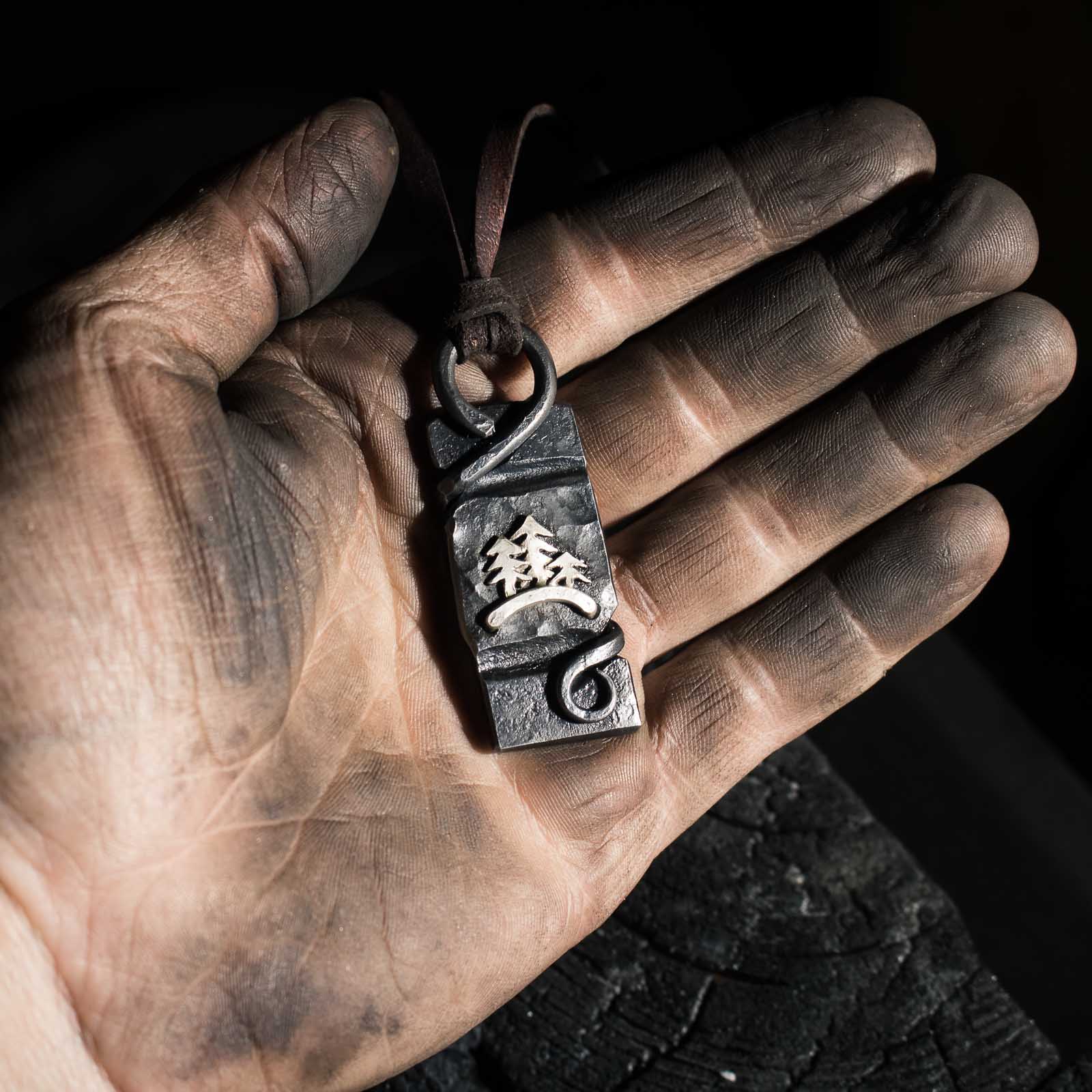 Crafted with Purpose: This pendant is hand-forged from solid iron with the pine trees made in silver. The surface is textured to evoke the ruggedness of the natural landscape. Stylized trees are carefully shaped in silver and integrated into the design, each one a mark made by the smith's hand. The process transforms raw metal into a miniature landscape, requiring skill and a thoughtful approach to capture the essence of the forest in enduring iron. Each pendant is a unique piece of authentic metalwork, born in the heat of the forge.