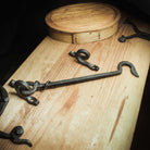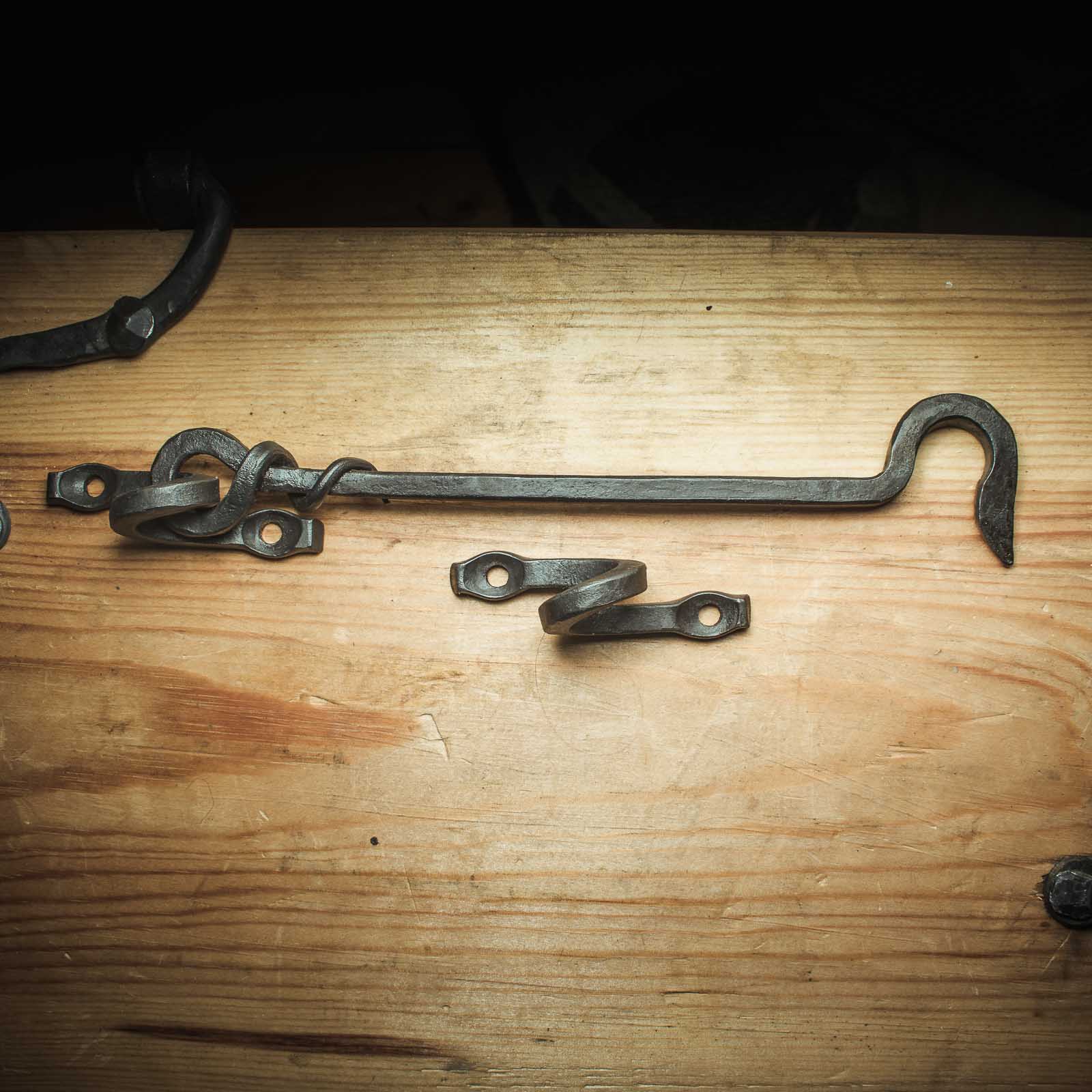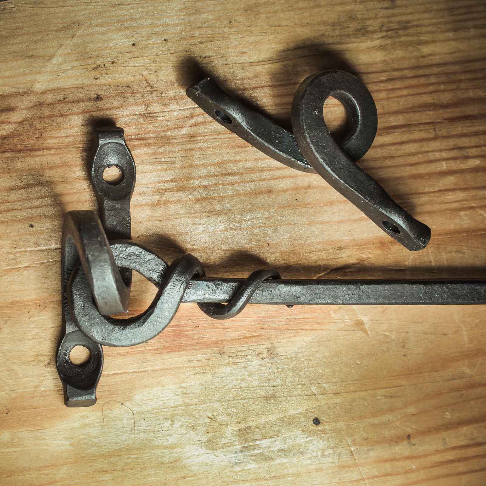 Crafted with Purpose: This gate latch is hand-forged from durable iron, built to secure and impress. The functional components – the sturdy bar, the reliable catch, the mounting staples – are shaped for maximum strength and longevity. The decorative twist in the bar is a testament to the smith's artistry, a complex detail born from controlling hot metal with precision and creativity. Every curve and texture showcases the skilled hand that brought this piece to life.