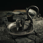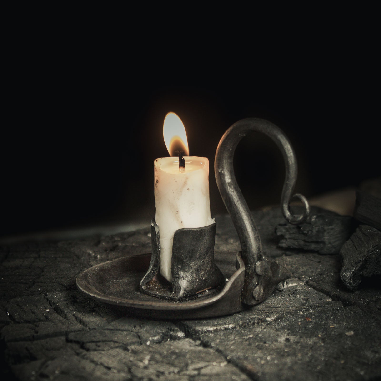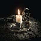 Crafted with Purpose: Hand-forged from iron, this candle holder is built to last, just like the artifacts that inspired it. The base is shaped to catch any drips, while the central holder securely embraces your candle. The distinctive handle is forged with a graceful curve, inviting you to carry the light or hang it where it's needed most. The visible hammer marks and the texture of the iron tell the story of its creation, connecting you to the timeless craft of the blacksmith.