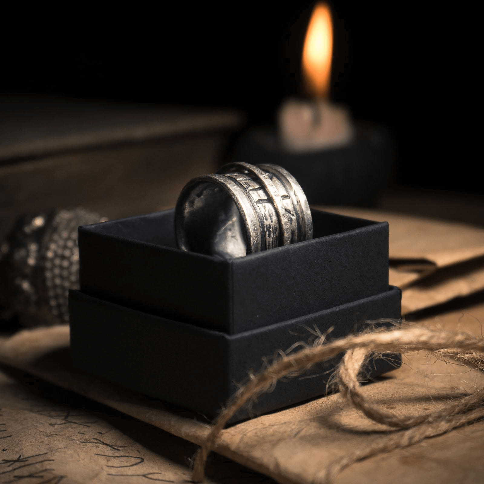 A Symbol for Your Story: This ring serves as a potent symbol for those who actively create their own path. Choose to adorn it with the ancient script of runes – symbols of wisdom, guidance, and power – to carry the echoes of the past with you. The optional spinner can represent the constant turning of time, the cycles of life, or serve as a grounding focus during moments of reflection. It is a piece that embodies strength, reminding you of your resilience, and a marker of the epic journey you are on. Wear it as a reminder of where you've been, and an anchor for where you are headed, leaving your unique mark upon the world.