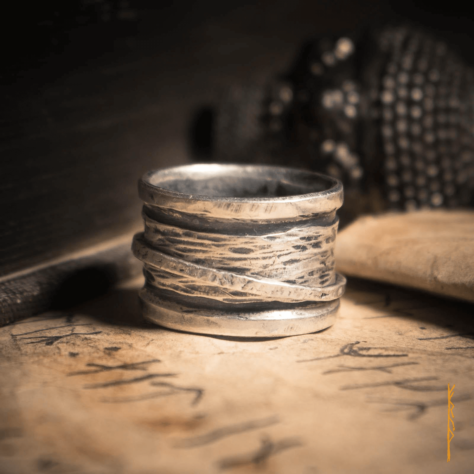 Crafted with Purpose: This piece is hand-forged from solid sterling silver. Using time-honored smithing techniques, layers of silver are meticulously shaped and joined, creating a substantial band with an authentic, tactile texture. Every hammer strike tells a story, ensuring each ring is uniquely born from the forge. The optional spinner element is carefully integrated, a smooth, moving layer within the steadfast band.